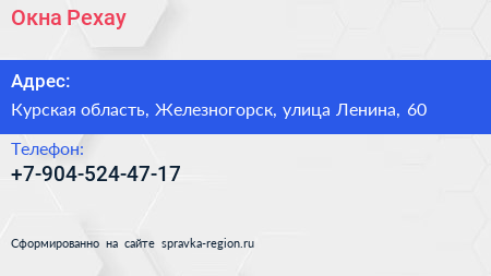 Окна Рехау по адресу Курская область, Железногорск, улица Ленина, 60 в дальнейшем Организация, размещена в следующих категориях: