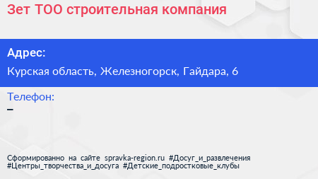 Зет ТОО, строительная компания по адресу Курская область, Железногорск, Гайдара, 6 в дальнейшем Организация, размещена в следующих категориях: