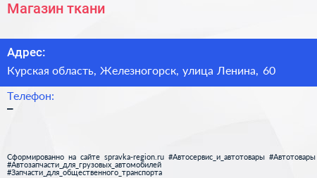 Магазин ткани по адресу Курская область, Железногорск, улица Ленина, 60 в дальнейшем Организация, размещена в следующих категориях: