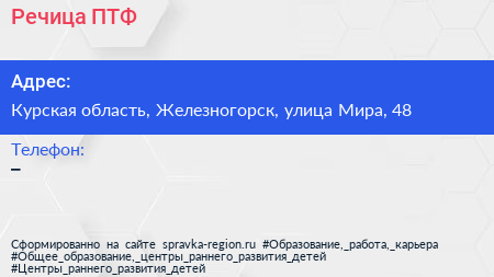 Речица ПТФ по адресу Курская область, Железногорск, улица Мира, 48 в дальнейшем Организация, размещена в следующих категориях: