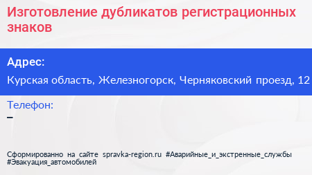 Изготовление дубликатов регистрационных знаков по адресу Курская область, Железногорск, Черняковский проезд, 12 в дальнейшем Организация, размещена в следующих категориях: