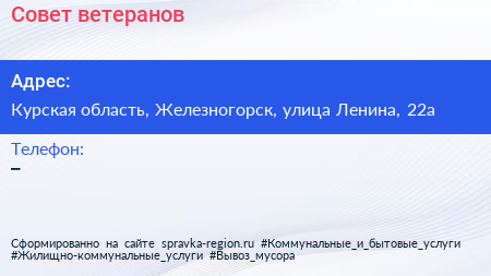 Совет ветеранов по адресу Курская область, Железногорск, улица Ленина, 22а в дальнейшем Организация, размещена в следующих категориях: