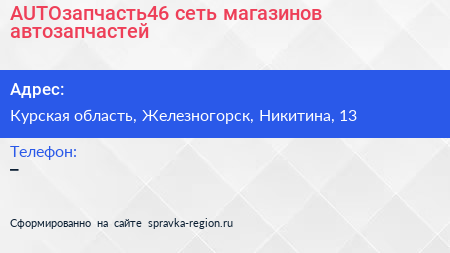 AUTOзапчасть46, сеть магазинов автозапчастей по адресу Курская область, Железногорск, Никитина, 13 в дальнейшем Организация, размещена в следующих категориях: