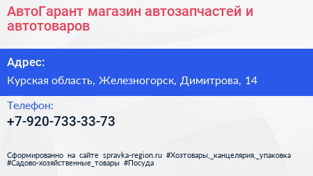 АвтоГарант, магазин автозапчастей и автотоваров по адресу Курская область, Железногорск, Димитрова, 14 в дальнейшем Организация, размещена в следующих категориях:
