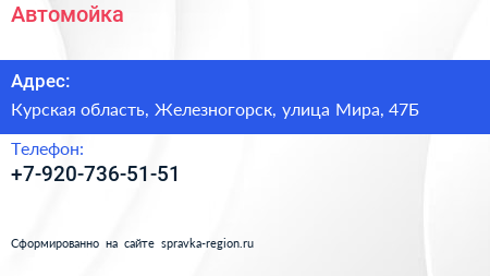Автомойка по адресу Курская область, Железногорск, улица Мира, 47Б в дальнейшем Организация, размещена в следующих категориях: