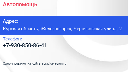Автопомощь по адресу Курская область, Железногорск, Черняковская улица, 2 в дальнейшем Организация, размещена в следующих категориях: