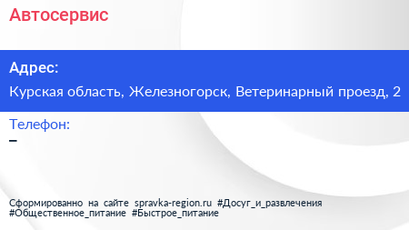 Автосервис по адресу Курская область, Железногорск, Ветеринарный проезд, 2 в дальнейшем Организация, размещена в следующих категориях: