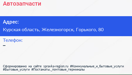 Автозапчасти по адресу Курская область, Железногорск, Горького, 80 в дальнейшем Организация, размещена в следующих категориях: