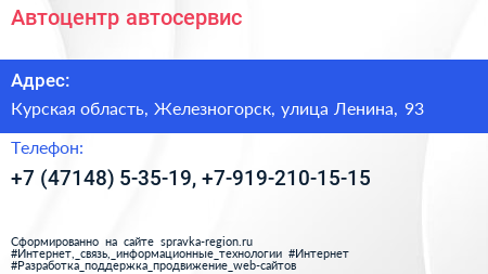 Автоцентр, автосервис по адресу Курская область, Железногорск, улица Ленина, 93 в дальнейшем Организация, размещена в следующих категориях: