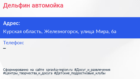 Дельфин, автомойка по адресу Курская область, Железногорск, улица Мира, 6а в дальнейшем Организация, размещена в следующих категориях: