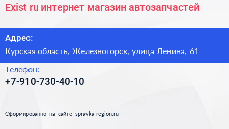 Exist.ru, интернет-магазин автозапчастей по адресу Курская область, Железногорск, улица Ленина, 61 в дальнейшем Организация, размещена в следующих категориях: