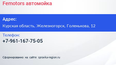 Femotors, автомойка по адресу Курская область, Железногорск, Голенькова, 12 в дальнейшем Организация, размещена в следующих категориях: