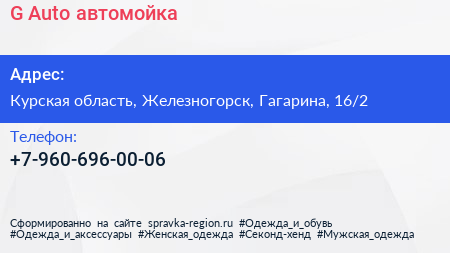 G-Auto, автомойка по адресу Курская область, Железногорск, Гагарина, 16/2 в дальнейшем Организация, размещена в следующих категориях: