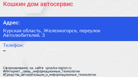 Кошкин дом, автосервис по адресу Курская область, Железногорск, переулок Автолюбителей, 3 в дальнейшем Организация, размещена в следующих категориях: