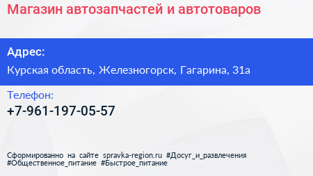 Магазин автозапчастей и автотоваров по адресу Курская область, Железногорск, Гагарина, 31а в дальнейшем Организация, размещена в следующих категориях: