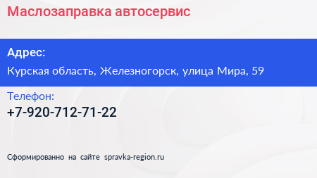 Маслозаправка, автосервис по адресу Курская область, Железногорск, улица Мира, 59 в дальнейшем Организация, размещена в следующих категориях: