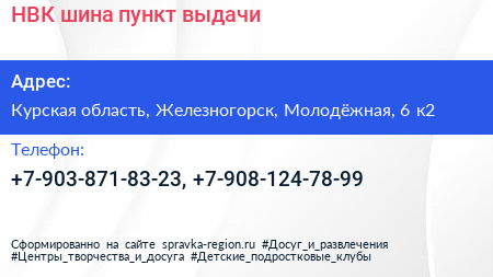 НВК шина, пункт выдачи по адресу Курская область, Железногорск, Молодёжная, 6 к2 в дальнейшем Организация, размещена в следующих категориях: