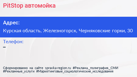 PitStop, автомойка по адресу Курская область, Железногорск, Черняковские горки, 30 в дальнейшем Организация, размещена в следующих категориях: