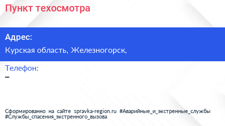 Пункт техосмотра по адресу Курская область, Железногорск, в дальнейшем Организация, размещена в следующих категориях: