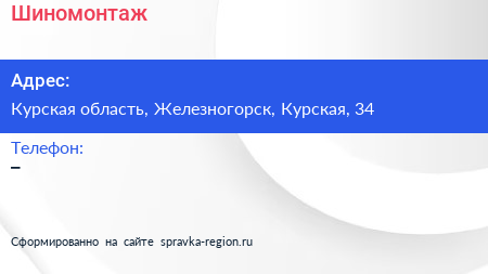 Шиномонтаж по адресу Курская область, Железногорск, Курская, 34 в дальнейшем Организация, размещена в следующих категориях: