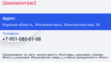 Шиномонтаж2 по адресу Курская область, Железногорск, Изыскательская, 14 в дальнейшем Организация, размещена в следующих категориях: