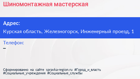 Шиномонтажная мастерская по адресу Курская область, Железногорск, Инженерный проезд, 1 в дальнейшем Организация, размещена в следующих категориях: