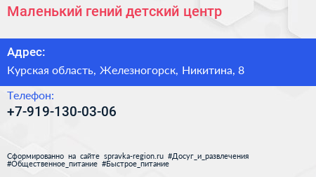 Маленький гений, детский центр по адресу Курская область, Железногорск, Никитина, 8 в дальнейшем Организация, размещена в следующих категориях: