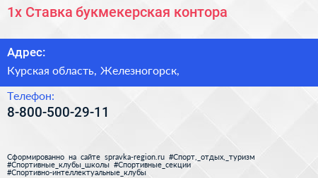 1х Ставка, букмекерская контора по адресу Курская область, Железногорск, в дальнейшем Организация, размещена в следующих категориях: