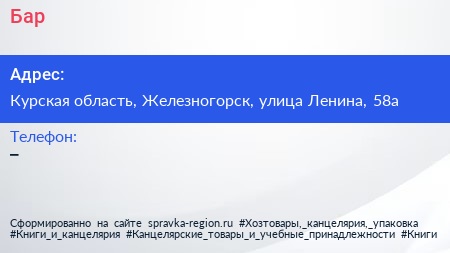 Бар по адресу Курская область, Железногорск, улица Ленина, 58а в дальнейшем Организация, размещена в следующих категориях: