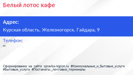 Белый лотос, кафе по адресу Курская область, Железногорск, Гайдара, 9 в дальнейшем Организация, размещена в следующих категориях: