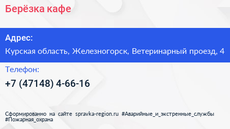 Берёзка, кафе по адресу Курская область, Железногорск, Ветеринарный проезд, 4 в дальнейшем Организация, размещена в следующих категориях: