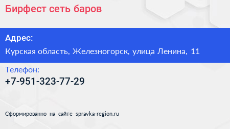 Бирфест, сеть баров по адресу Курская область, Железногорск, улица Ленина, 11 в дальнейшем Организация, размещена в следующих категориях:
