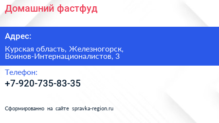 Домашний фастфуд по адресу Курская область, Железногорск, Воинов-Интернационалистов, 3 в дальнейшем Организация, размещена в следующих категориях: