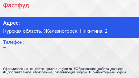 Фастфуд по адресу Курская область, Железногорск, Никитина, 2 в дальнейшем Организация, размещена в следующих категориях: