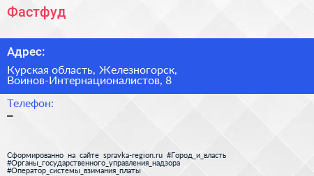 Фастфуд по адресу Курская область, Железногорск, Воинов-Интернационалистов, 8 в дальнейшем Организация, размещена в следующих категориях: