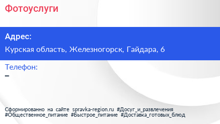 Фотоуслуги по адресу Курская область, Железногорск, Гайдара, 6 в дальнейшем Организация, размещена в следующих категориях: