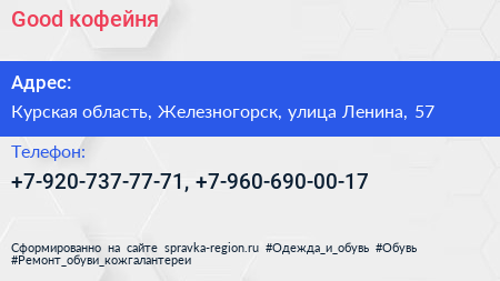 Good, кофейня по адресу Курская область, Железногорск, улица Ленина, 57 в дальнейшем Организация, размещена в следующих категориях: