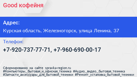 Good, кофейня по адресу Курская область, Железногорск, улица Ленина, 37 в дальнейшем Организация, размещена в следующих категориях: