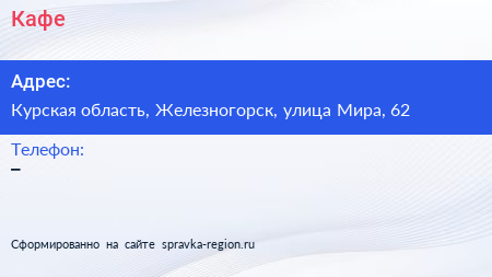 Кафе по адресу Курская область, Железногорск, улица Мира, 62 в дальнейшем Организация, размещена в следующих категориях: