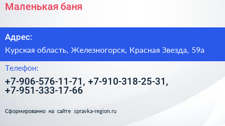 Маленькая баня по адресу Курская область, Железногорск, Красная Звезда, 59а в дальнейшем Организация, размещена в следующих категориях: