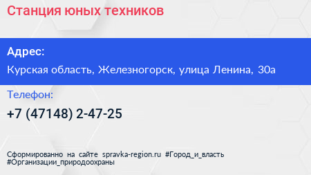 Станция юных техников по адресу Курская область, Железногорск, улица Ленина, 30а в дальнейшем Организация, размещена в следующих категориях: