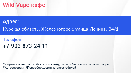 Wild Vape, кафе по адресу Курская область, Железногорск, улица Ленина, 34/1 в дальнейшем Организация, размещена в следующих категориях: