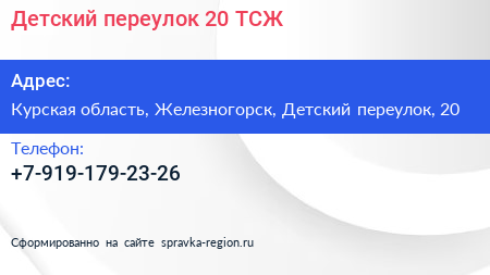 Детский переулок 20, ТСЖ по адресу Курская область, Железногорск, Детский переулок, 20 в дальнейшем Организация, размещена в следующих категориях: