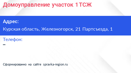 Домоуправление, участок №1, ТСЖ по адресу Курская область, Железногорск, 21 Партсъезда, 1 в дальнейшем Организация, размещена в следующих категориях: