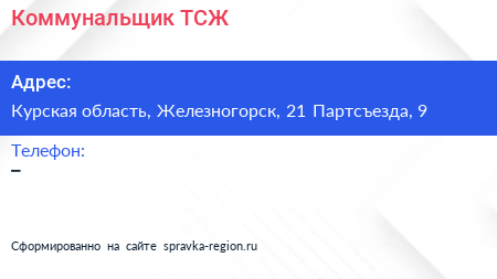 Коммунальщик, ТСЖ по адресу Курская область, Железногорск, 21 Партсъезда, 9 в дальнейшем Организация, размещена в следующих категориях: