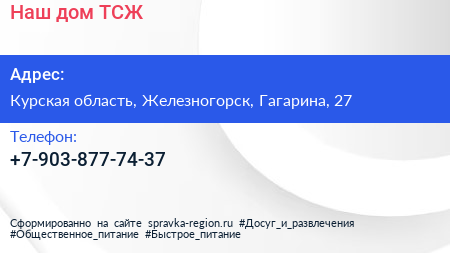 Наш дом, ТСЖ по адресу Курская область, Железногорск, Гагарина, 27 в дальнейшем Организация, размещена в следующих категориях:
