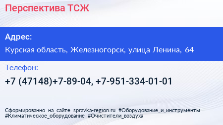 Перспектива, ТСЖ по адресу Курская область, Железногорск, улица Ленина, 64 в дальнейшем Организация, размещена в следующих категориях: