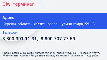 Qiwi, терминал по адресу Курская область, Железногорск, улица Мира, 59 к3 в дальнейшем Организация, размещена в следующих категориях: