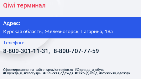 Qiwi, терминал по адресу Курская область, Железногорск, Гагарина, 18а в дальнейшем Организация, размещена в следующих категориях: