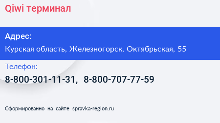 Qiwi, терминал по адресу Курская область, Железногорск, Октябрьская, 55 в дальнейшем Организация, размещена в следующих категориях: